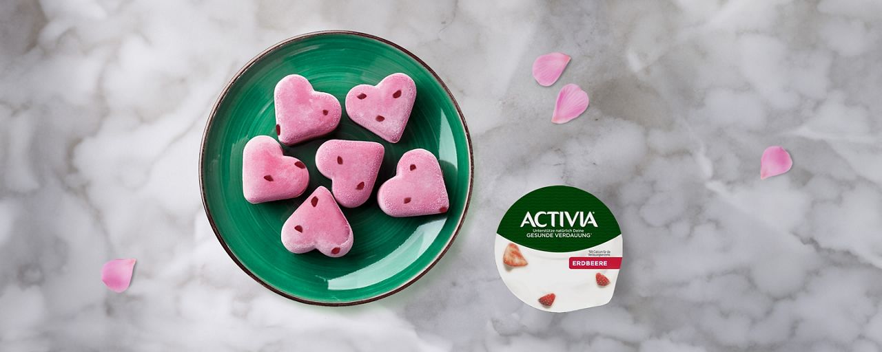 In einer Schüssel ACTIVIA Erdbeere mit Honig und Vanilleextrakt gut vermischen, bis alles gleichmäßig ist. Alles mit einem Löffel in die einzelnen Herzförmchen geben, bis diese komplett gefüllt sind.